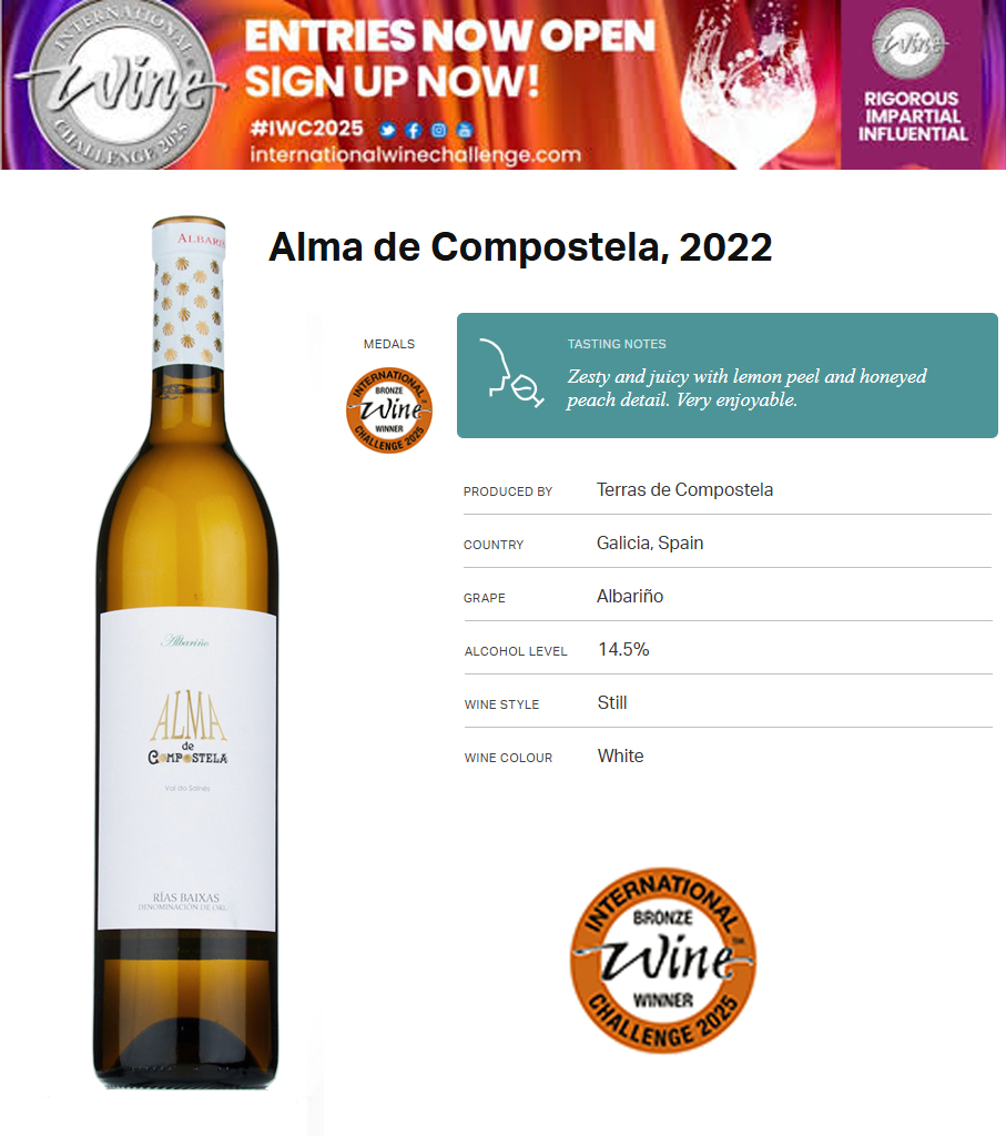 El Albariño ALMA DE COMPOSTELA 2022 es galardonado con medalla de BRONCE en